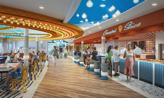 Guests will stroll along the boardwalk alongside colorful and playful designs, including a fun Ferris wheel- inspired ceiling feature, and casual seating areas, both inside and outside. Guests can enjoy a fresh hot pizza at Coastal Slice or try a tasty sandwich or hot dog at Beach Buns. Marina Bar features fun nautical designs and comfortable lounge seating for enjoying coffee and cocktails inside by the boardwalk or outside by the sea. Rudi’s Seagrill and Cucina del Capitano return with indoor and al fresco seating.